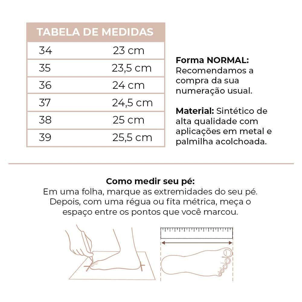 Versátil e prática, a Flatform Metais Dulce combina com looks casuais do dia a dia, como jeans, vestidos leves, saias e até shorts. Perfeita para quem não abre mão de estar estilosa e confortável ao mesmo tempo.