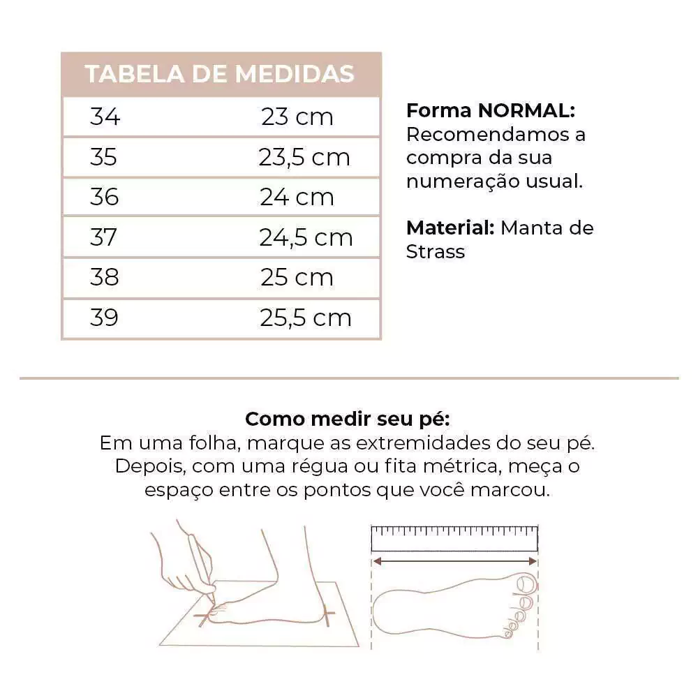 A Rasteira Strass Hera possui a forma NORMAL, portanto recomendamos a compra do seu tamanho usual.
