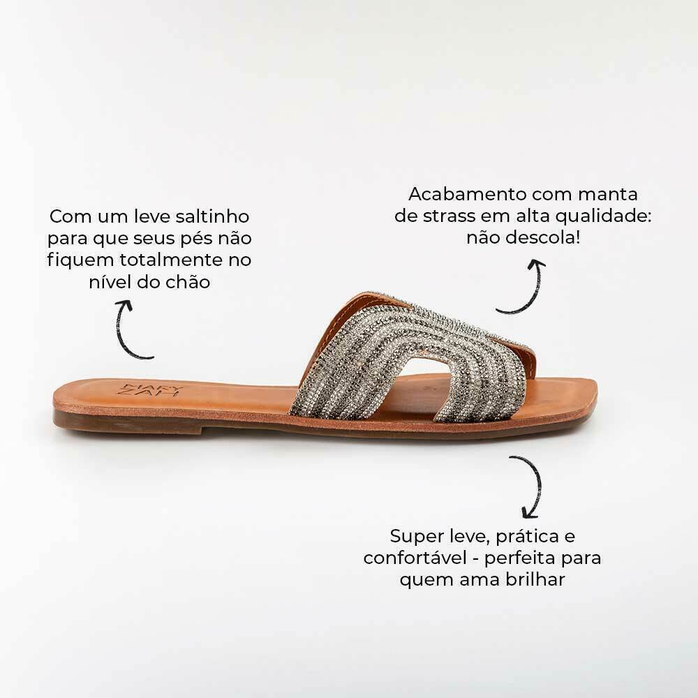 A Rasteira Strass Hera é um modelo fashion e moderno, perfeito para quem gosta de estar sempre estilosa no dia a dia. Esta rasteira possui detalhes em strass, que trazem um charme a mais ao modelo e fazem você brilhar!