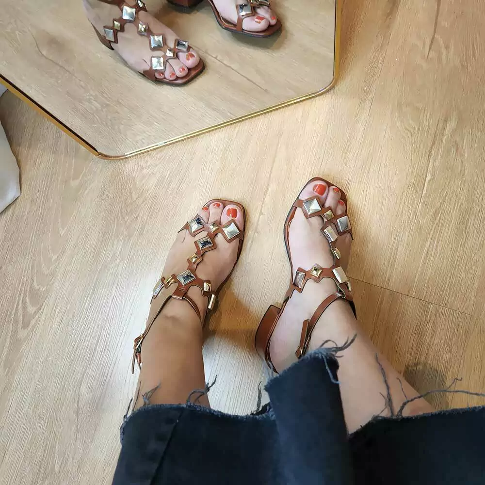Esta sandália possui aplicações em metal e fivela regulável que se ajusta aos seus pés, deixando o modelo mais prático e confortável.
