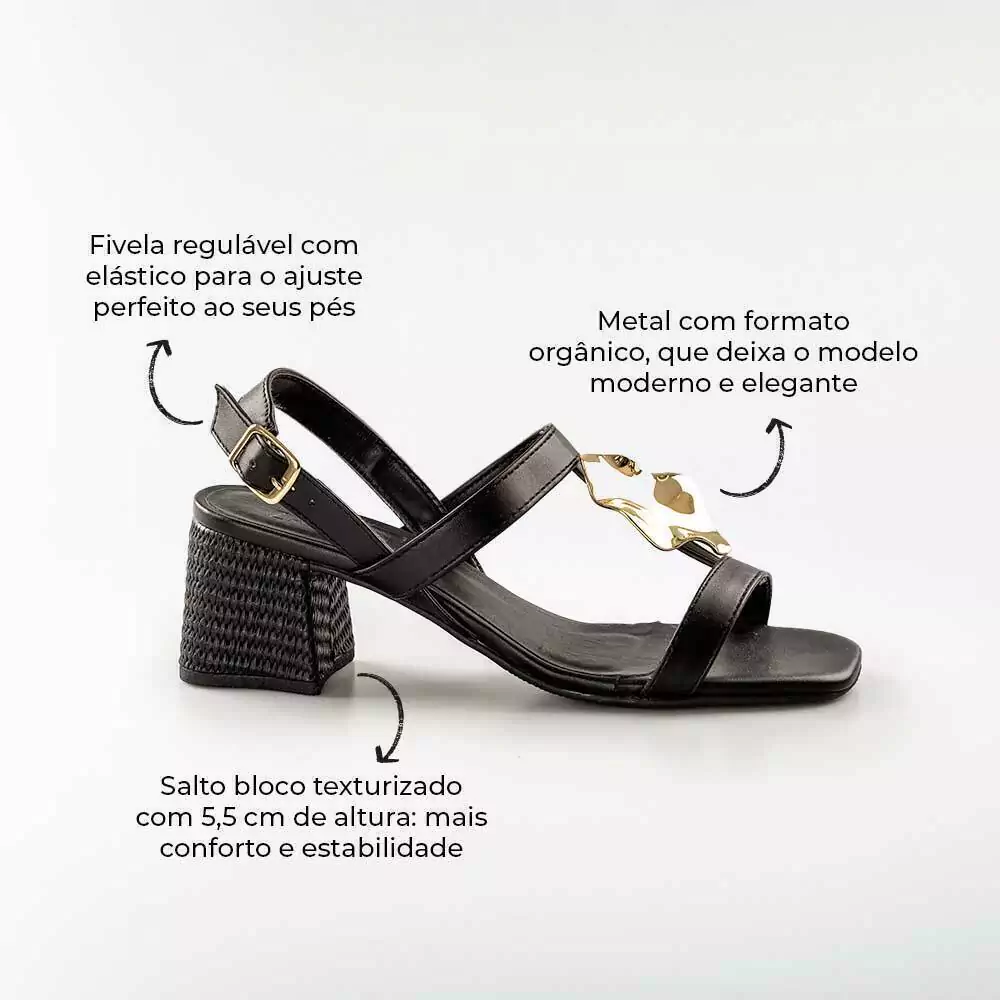 Esta sandália possui aplicação em metal orgânico e fivela regulável com elástico que se ajusta aos seus pés, deixando o modelo mais prático e confortável.