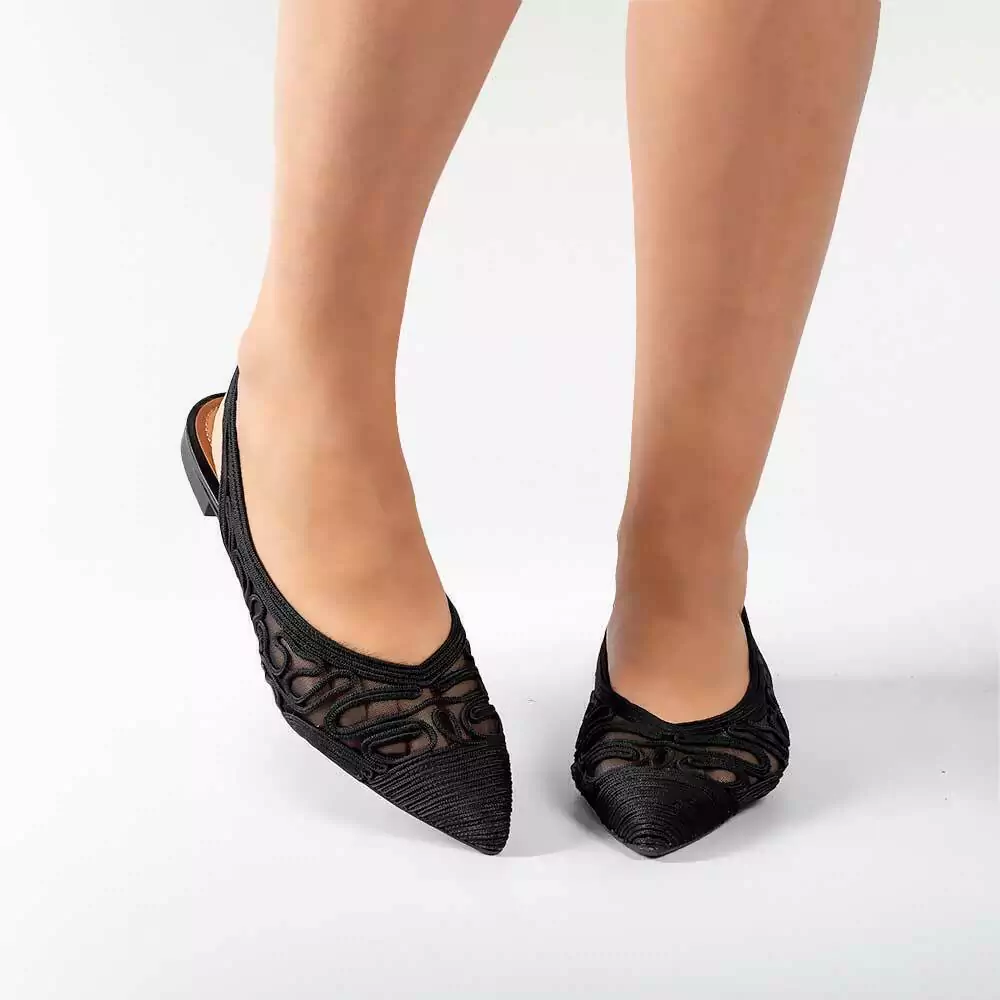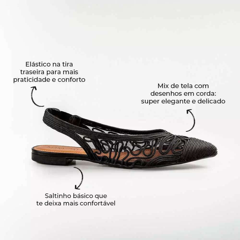 Esta sapatilha possui bico fino, fivela com elástico, que facilita na hora de calçar e é toda trabalhada no bordado.
